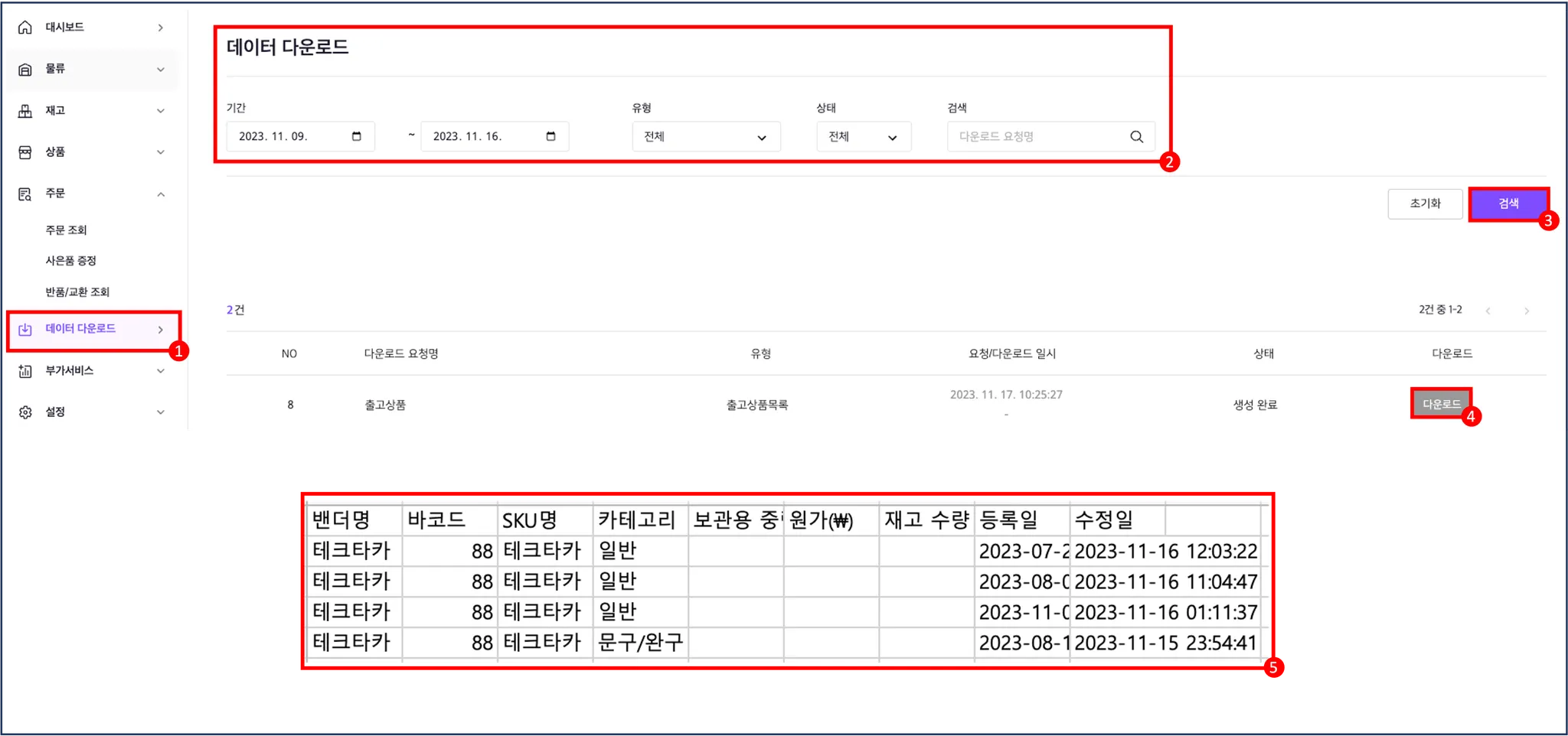 다운로드 요청시 설정하신 조건에 따라 엑셀 시트를 조회하실 수 있습니다.