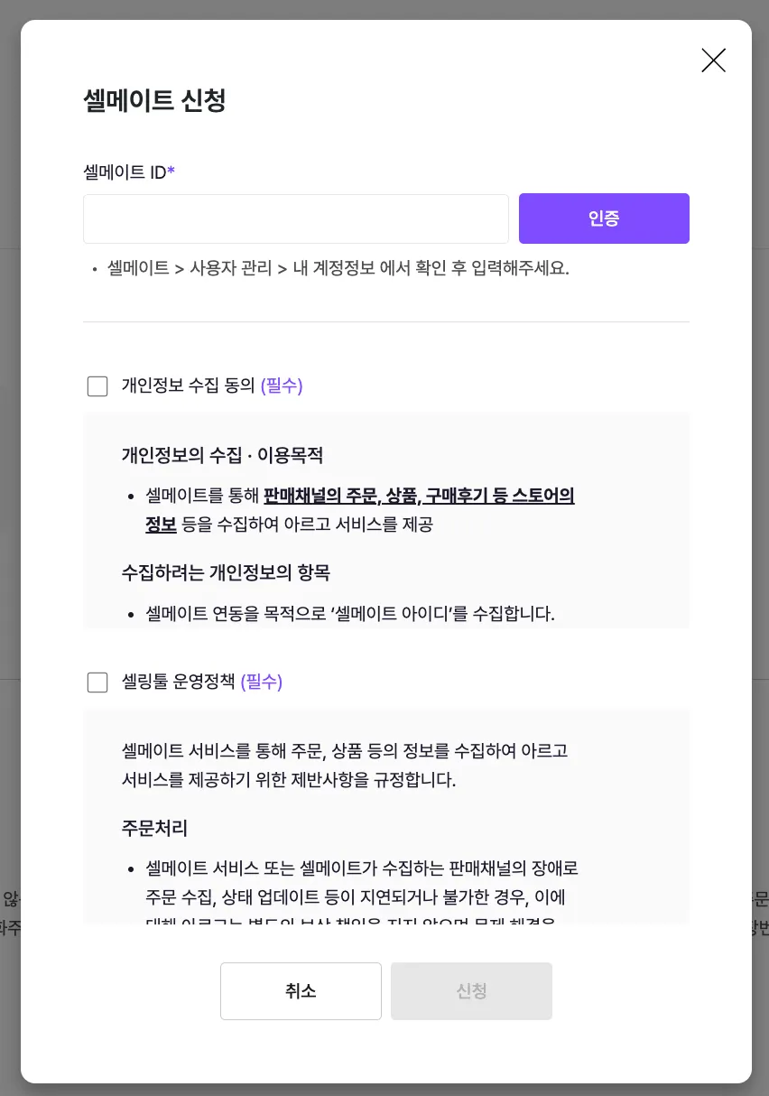 아르고 풀필먼트 서비스 > 부가서비스 > 셀링툴 연동에서 “서비스 신청”을 선택, 셀메이트 ID를 입력하고 약관동의를 체크하여 신청해주세요.
