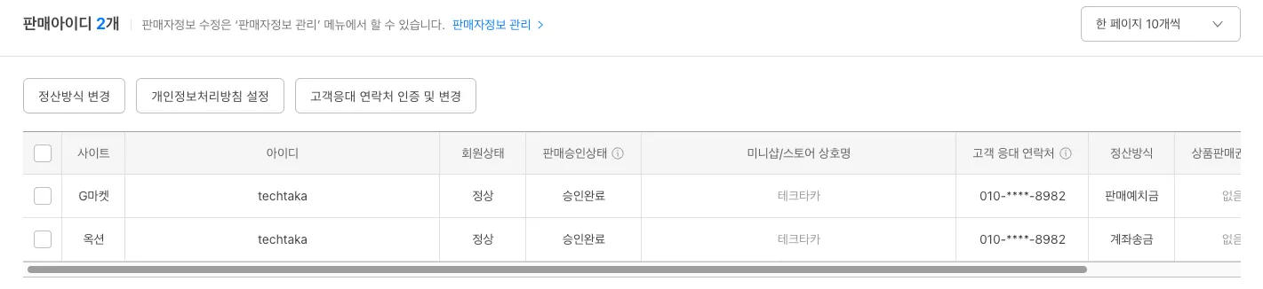 쇼핑몰계정관리 [판매자 마스터 ID]에 techtaka 를 입력합니다.