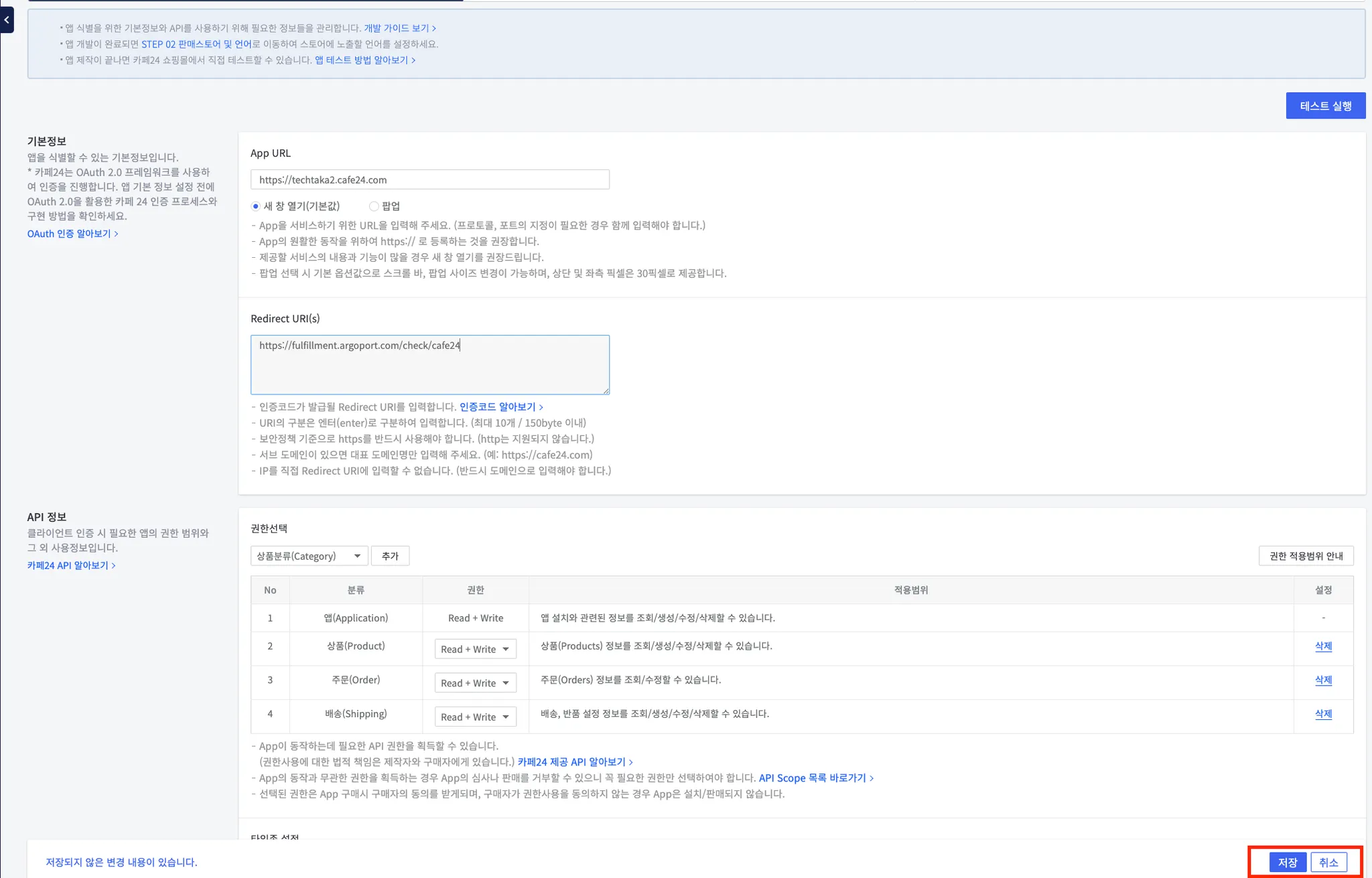 Redirect URI(s) : https://fulfillment.argoport.com/check/cafe24