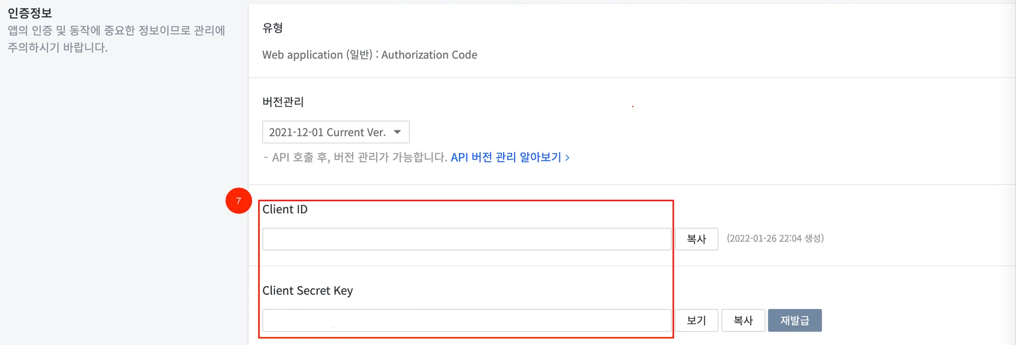 Client ID, Client Secret Key를 복사합니다.