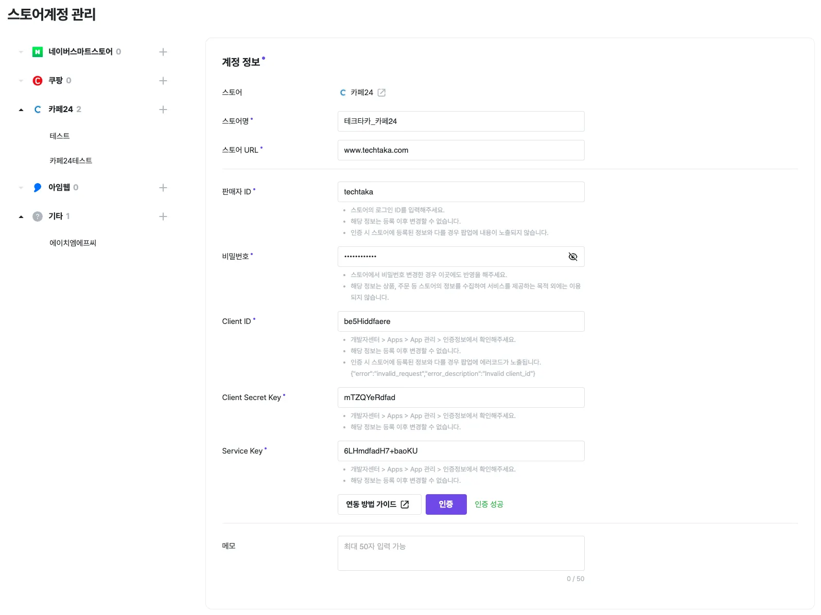 판매자 ID를 잘못 입력하는 경우 사이트에 연결할 수 없음 오류가 발생합니다. 오타 수정 후 다시 인증버튼을 클릭해주세요.