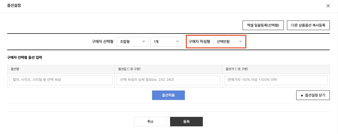 카카토톡 스토어 상품등록시 구매자 작성형 옵션을 사용할 경우 자동으로 출고가 불가능합니다. 가급적 구매자 작성형 옵션을 사용하지 않도록 상품을 관리해주세요.