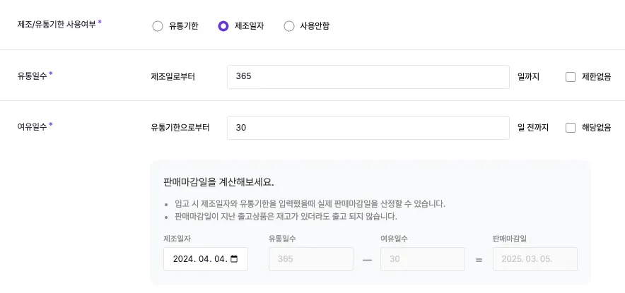 사용안함 : 제조/유통기한이 없을 시 선택합니다.