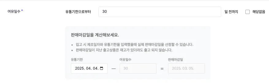유통기한이 2025.4.4 인 상품의 여유일수를 30일 전까지로 설정한 경우,