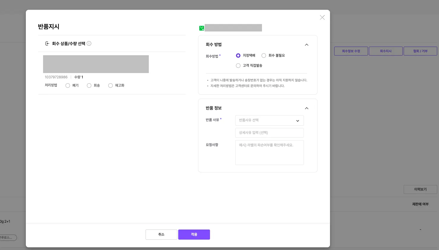 회수지시 시 회수방법, 반품 처리방법, 반품사유 및 요청사항을 등록할 수 있습니다.