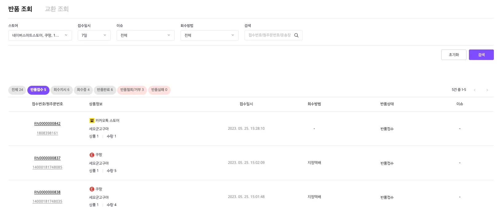 구매자가 반품을 요청하는 경우, 연동된 판매채널에 한해 자동으로 반품주문을 수집하며 ‘반품 조회’화면에서 ‘반품접수’ 상태의 주문을 확인할 수 있습니다.