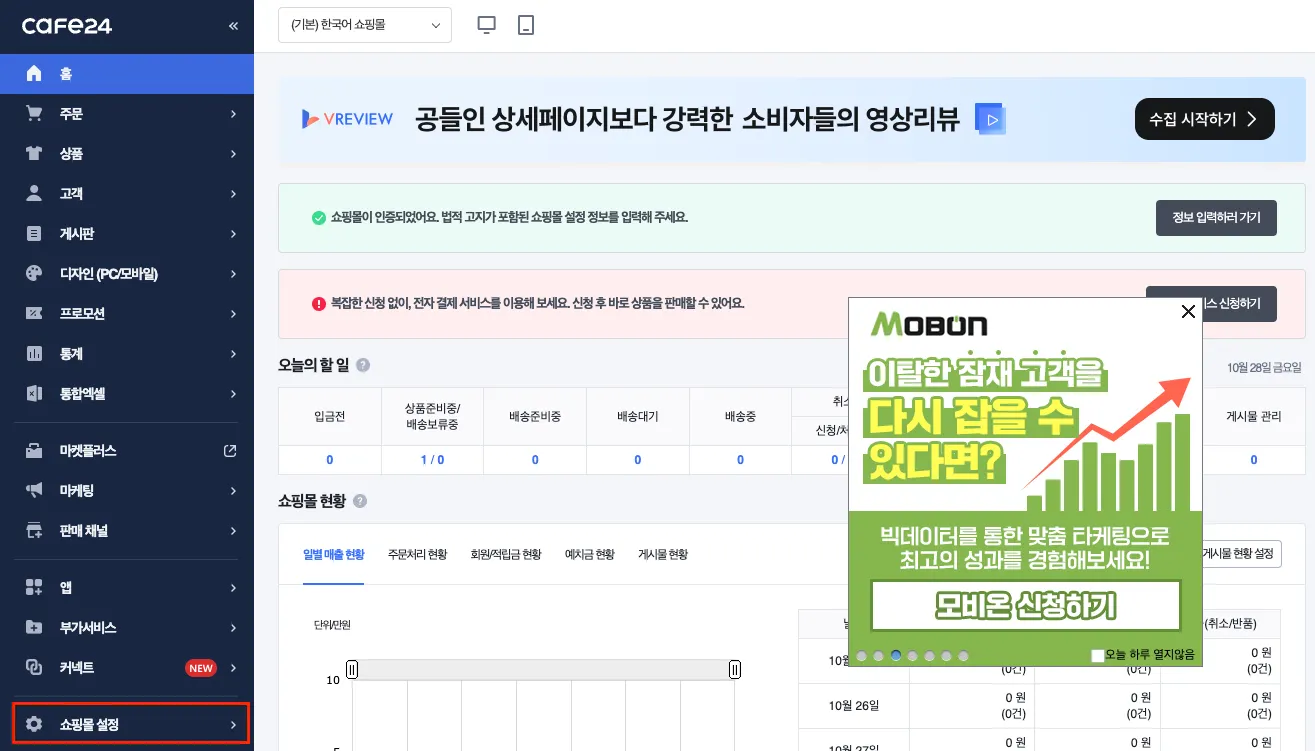 카페 24 주문 수집을 위해서 반드시 설정해주세요.