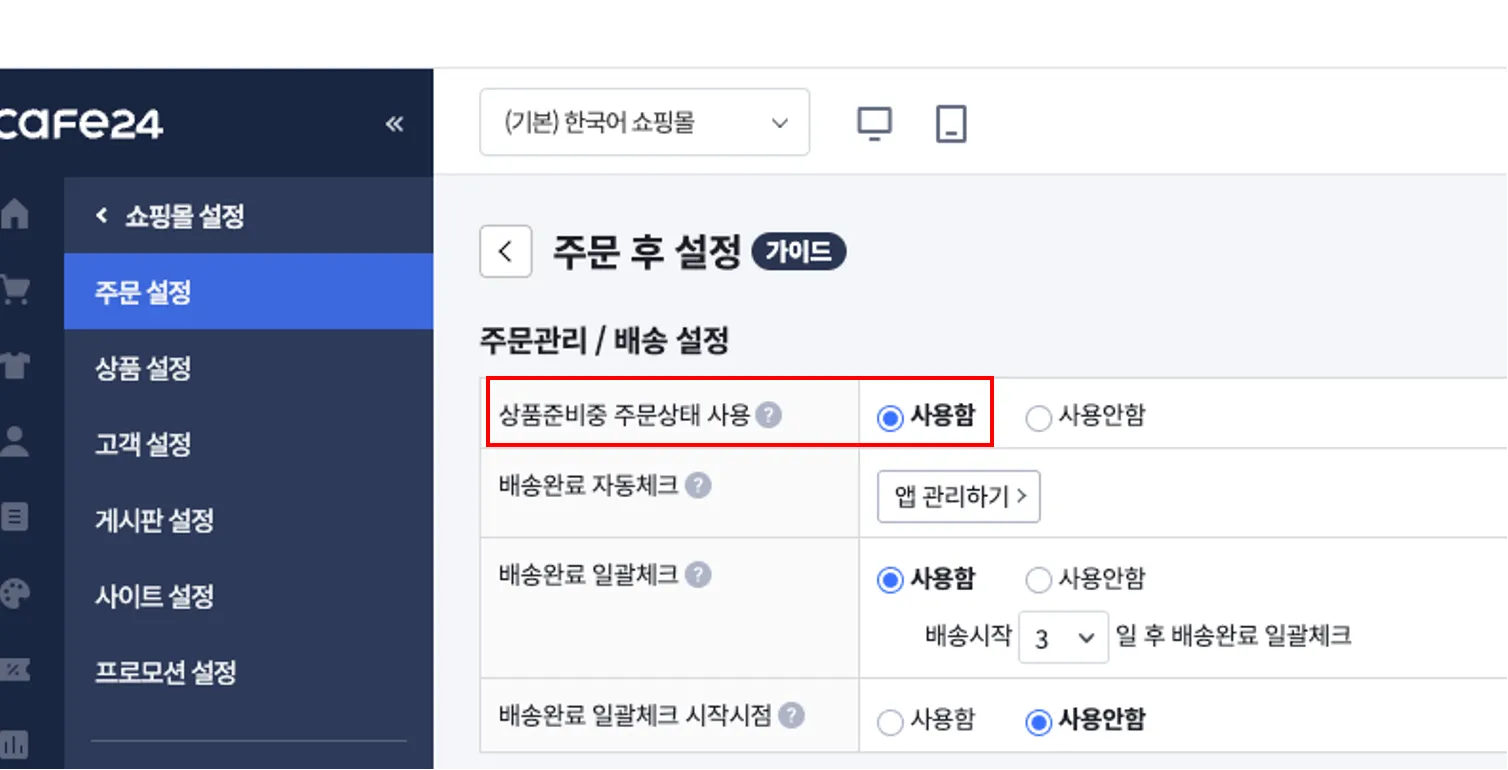 쇼핑몰 설정 → 주문설정 → 주문 후 설정 → “상품준비중 주문상태 사용”을 “사용함”으로 설정해주세요.