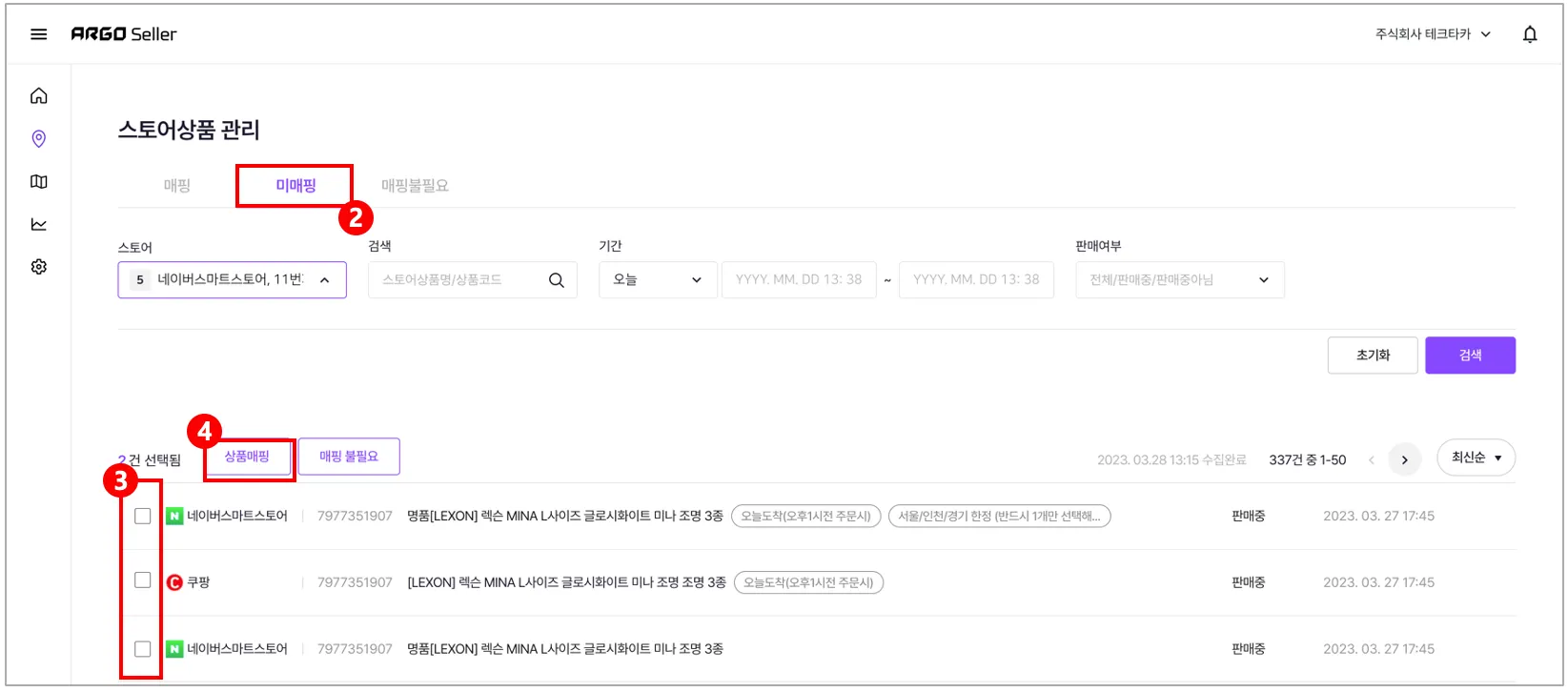 ‘ARGO FULFILMENT → 스토어상품 관리 → 미매핑’ 메뉴로 이동하세요.