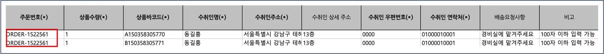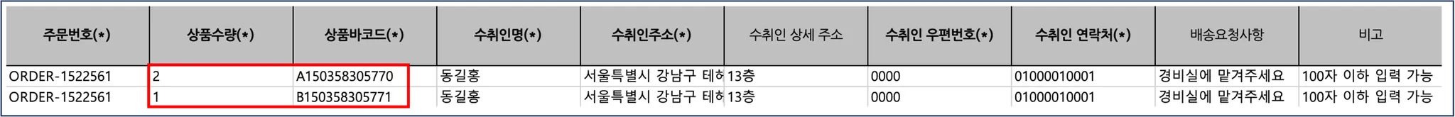 예시 2-1) 동일한 주문번호에 바코드를 분리해서 입력하면 업로드시 에러가 발생합니다.