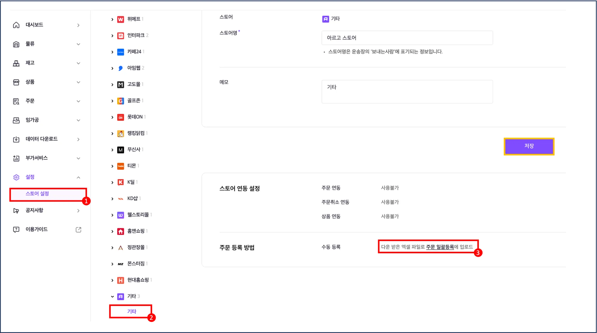 연동되지 않은 쇼핑몰의 주문을 출고하기 위해서는 스토어계정관리에서 기타 쇼핑몰을 만들고, 엑셀로 주문을 업로드 해야합니다.