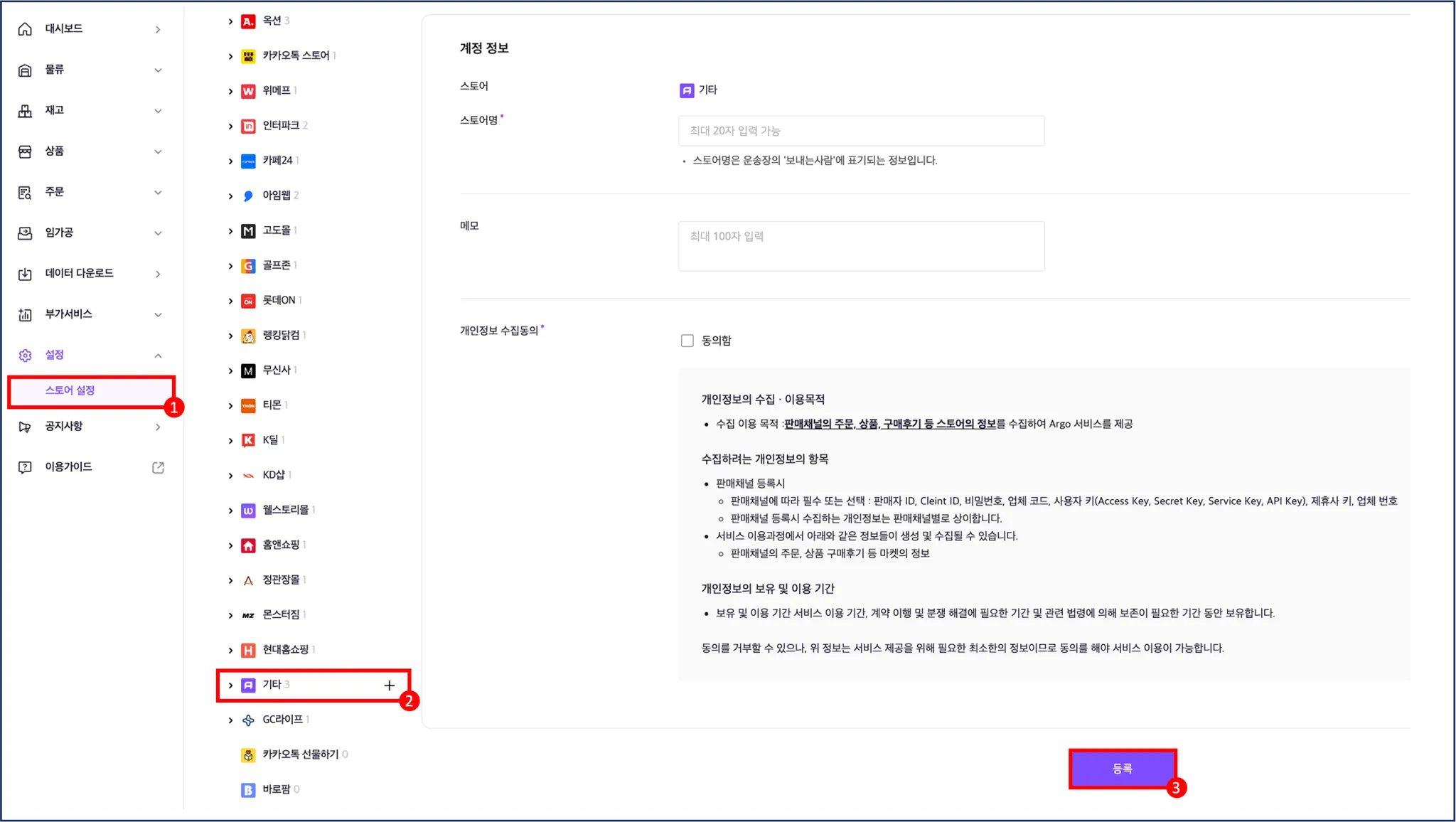 ARGO FULFILLMENT → 스토어 설정 → 기타 우측의 + 버튼을 클릭합니다.