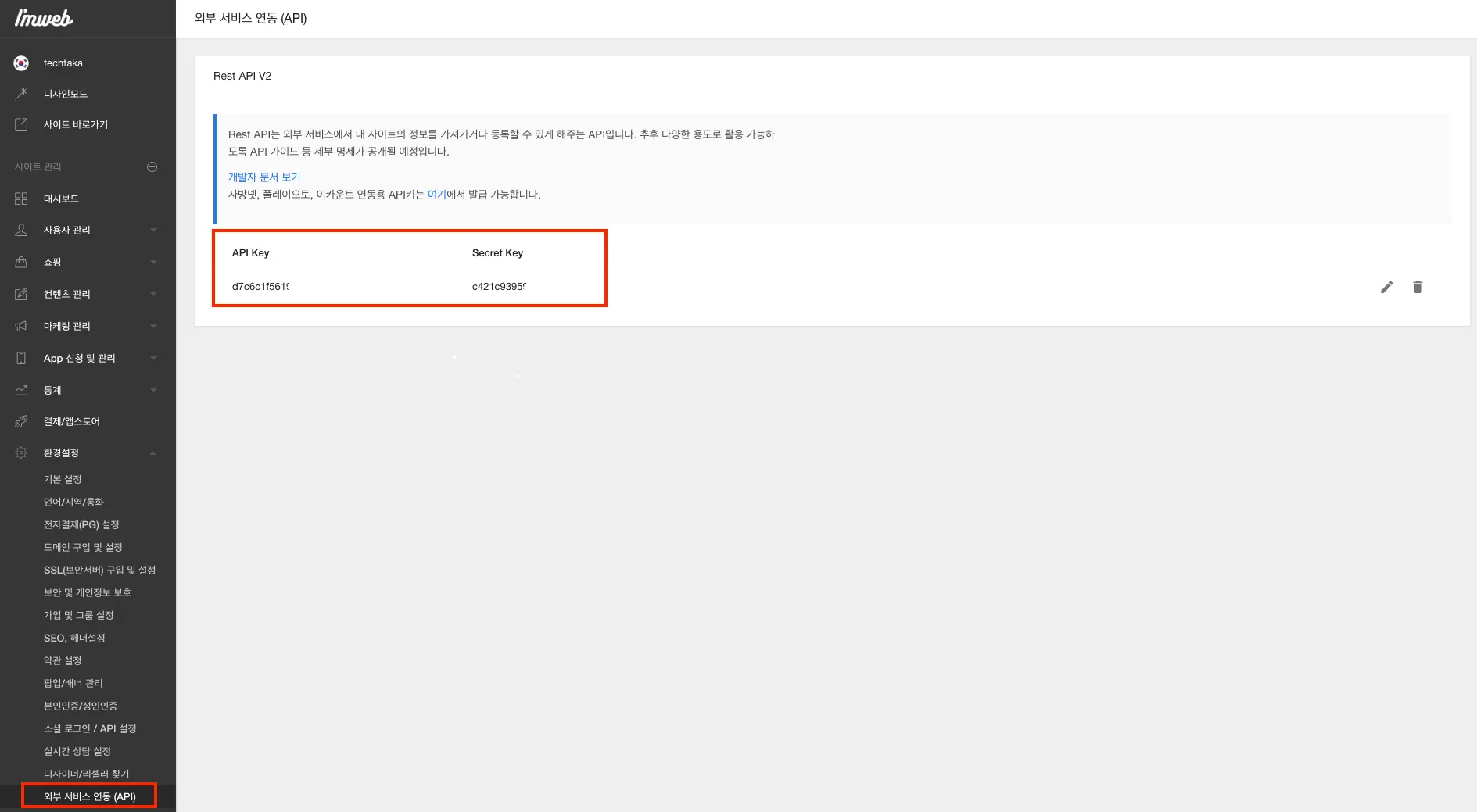 환경설정 > 외부 서비스연동 (API) 메뉴에서 API Key, Secret를 복사합니다.